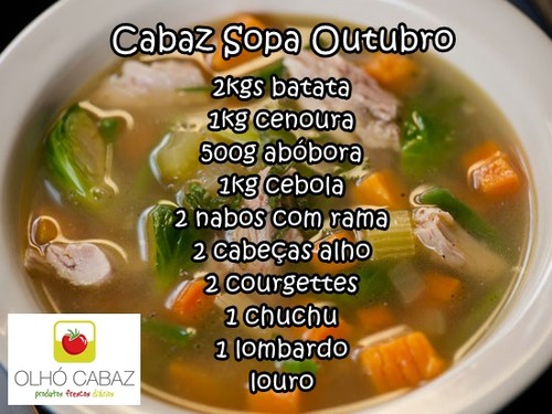 Este é o cabaz com tudo o que necessita para fazer sopas nutritivas e cheias de sabor, para encomenda durante todo o mês de Outubro. Poderá sempre fazer substituições, sobretudo de legumes de semana para semana.